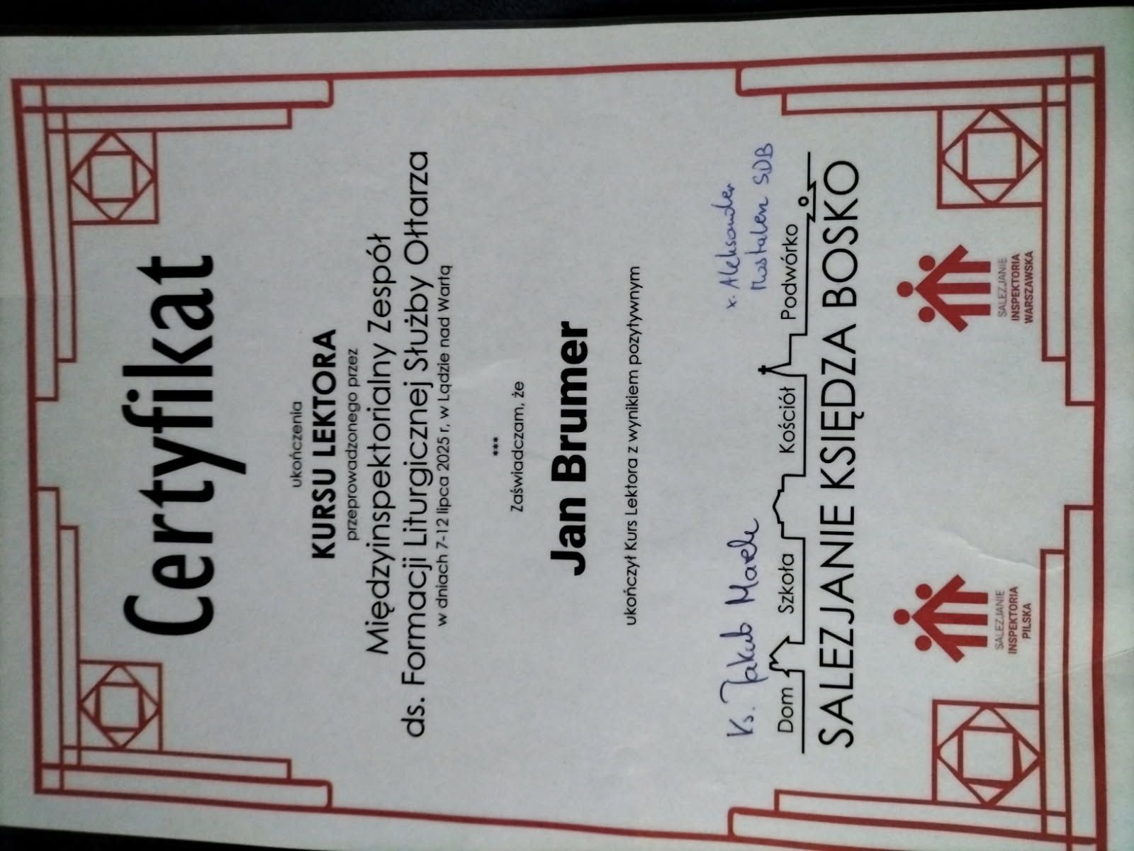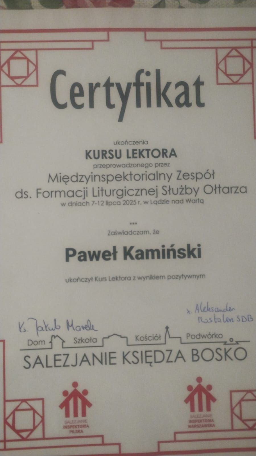 Jaś Brumer i Pawel Kamiński wzięli udział w kursie lektorów, jaki dobywał się w salezjańskim klasztorze w Ladzie nad Wartą (7-12 lipca 2025). Kurs był organizowany dla ministrantów z północnych inspektorii (od Różanegostoku do Szczecina). Egzaminy zdali na 5+. Gratulujemy!