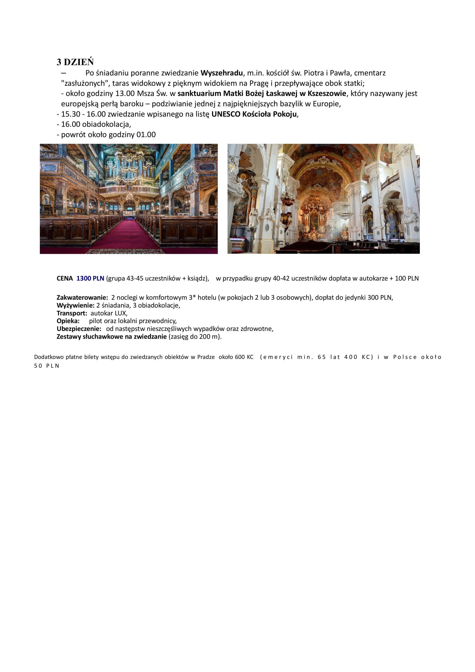 Dzień trzeci - Po śniadaniu poranne zwiedzanie Wyszehradu, m.in. kościół św. Piotra i Pawła, cmentarz "zasłużonych", taras widokowy z pięknym widokiem na Pragę i przepływające obok statki; Msza Św. w sanktuarium Matki Bożej Łaskawej w Kszeszowie, który nazywany jest europejską perłą baroku – podziwianie jednej z najpiękniejszych bazylik w Europie, zwiedzanie wpisanego na listę UNESC Kościoła Pokoju.