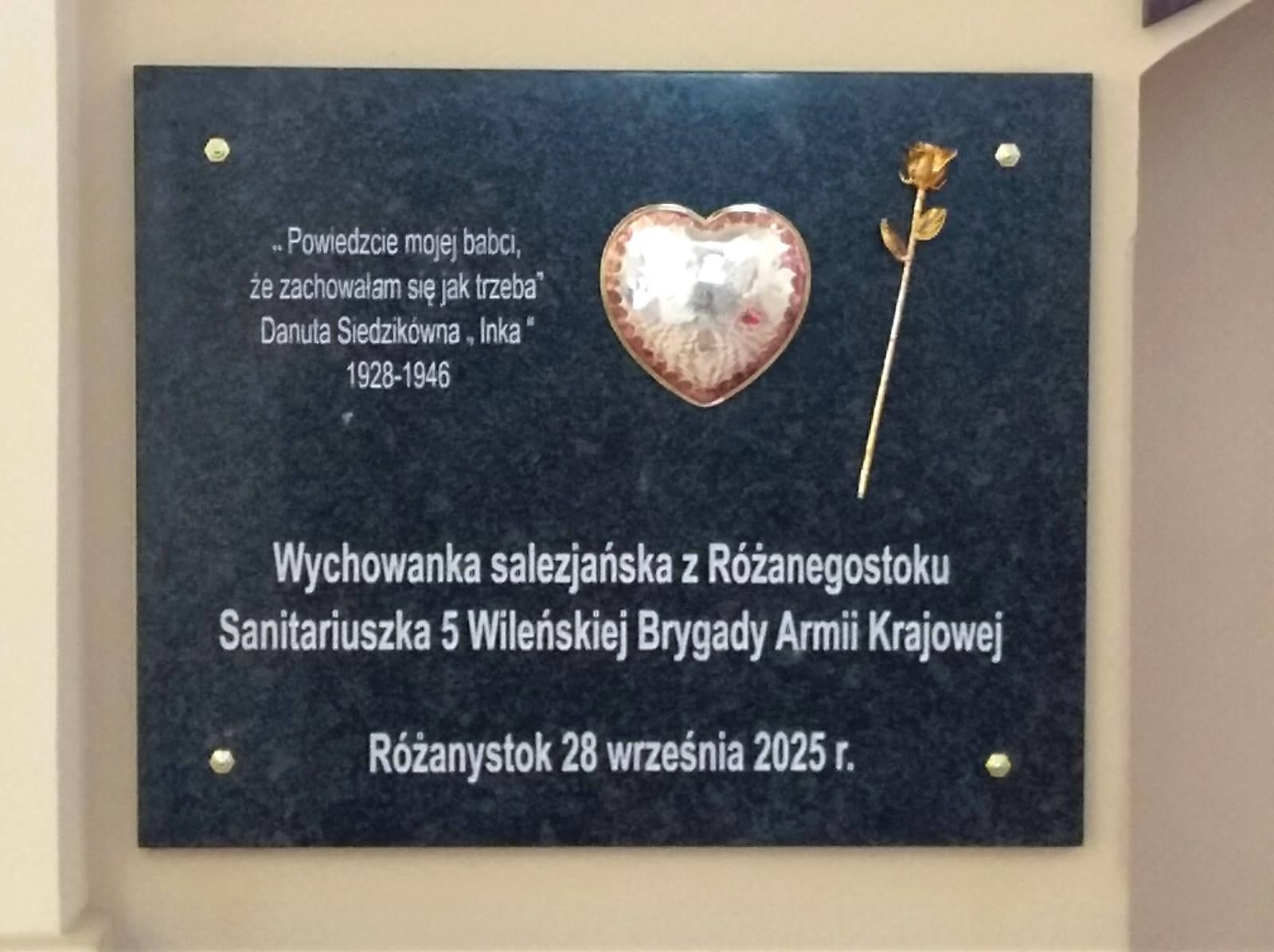 ,,Serce dla Inki’’ w Sanktuarium Matki Bożej Różanostockiej W niedzielę 28 września 2025 roku w bazylice Ofiarowania NMP podczas koncelebrowanej przez 12 kapłanów mszy św. o godz. 12.00 miała miejsce uroczystość odsłonięcia tablicy „Serce dla Inki”, upamiętniającej Danutę Siedzikównę, różanostocką parafiankę, sanitariuszkę 5 Wileńskiej Brygady AK, wychowankę salezjańską, straconą w 1946 roku w wyniku mordu sądowego.